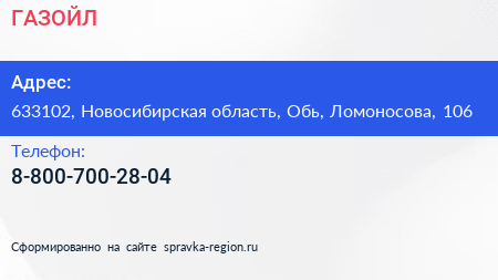 ГАЗОЙЛ по адресу 633102, Новосибирская область, Обь, Ломоносова, 106 в дальнейшем Организация, размещена в следующих категориях: