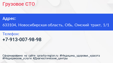 Грузовое СТО по адресу 633104, Новосибирская область, Обь, Омский тракт, 1/1 в дальнейшем Организация, размещена в следующих категориях: