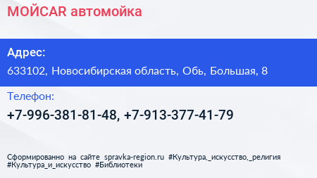 МОЙCAR, автомойка по адресу 633102, Новосибирская область, Обь, Большая, 8 в дальнейшем Организация, размещена в следующих категориях:
