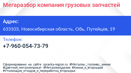 Мегаразбор, компания грузовых запчастей по адресу 633103, Новосибирская область, Обь, Путейцев, 19 в дальнейшем Организация, размещена в следующих категориях: