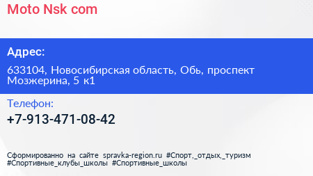 Moto-Nsk.com по адресу 633104, Новосибирская область, Обь, проспект Мозжерина, 5 к1 в дальнейшем Организация, размещена в следующих категориях: