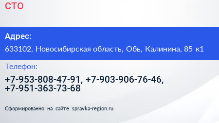 СТО по адресу 633102, Новосибирская область, Обь, Калинина, 85 к1 в дальнейшем Организация, размещена в следующих категориях: