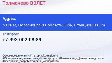 Толмачево-ВЗЛЕТ по адресу 633102, Новосибирская область, Обь, Станционная, 2а в дальнейшем Организация, размещена в следующих категориях: