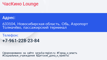 ЧасКино Lounge по адресу 633104, Новосибирская область, Обь, Аэропорт Толмачёво, пассажирский терминал в дальнейшем Организация, размещена в следующих категориях: