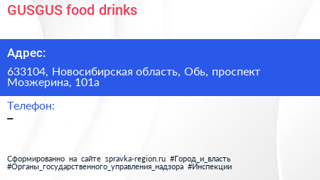 GUSGUS food & drinks по адресу 633104, Новосибирская область, Обь, проспект Мозжерина, 101а в дальнейшем Организация, размещена в следующих категориях: