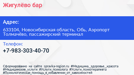 Жигулёво, бар по адресу 633104, Новосибирская область, Обь, Аэропорт Толмачёво, пассажирский терминал в дальнейшем Организация, размещена в следующих категориях: