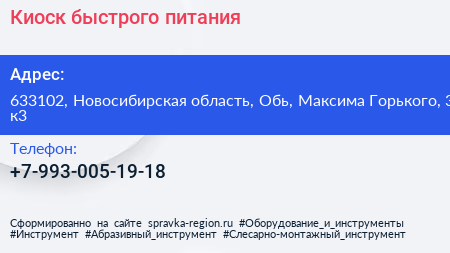 Киоск быстрого питания по адресу 633102, Новосибирская область, Обь, Максима Горького, 3 к3 в дальнейшем Организация, размещена в следующих категориях: