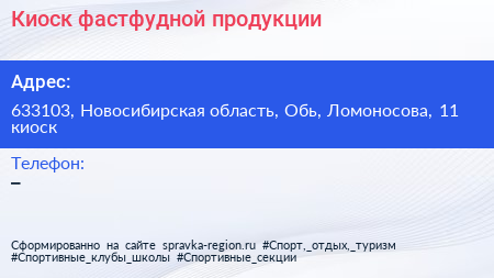 Киоск фастфудной продукции по адресу 633103, Новосибирская область, Обь, Ломоносова, 11 киоск в дальнейшем Организация, размещена в следующих категориях:
