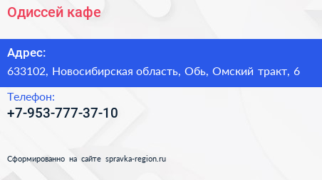 Одиссей, кафе по адресу 633102, Новосибирская область, Обь, Омский тракт, 6 в дальнейшем Организация, размещена в следующих категориях: