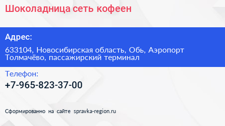 Шоколадница, сеть кофеен по адресу 633104, Новосибирская область, Обь, Аэропорт Толмачёво, пассажирский терминал в дальнейшем Организация, размещена в следующих категориях: