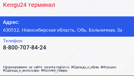 Kengu24, терминал по адресу 630512, Новосибирская область, Обь, Больничная, 3а в дальнейшем Организация, размещена в следующих категориях: