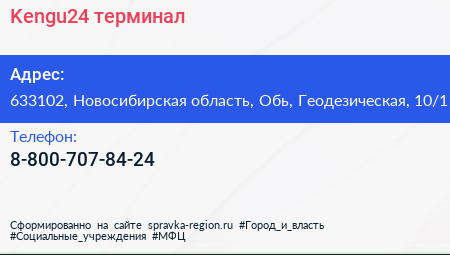 Kengu24, терминал по адресу 633102, Новосибирская область, Обь, Геодезическая, 10/1 в дальнейшем Организация, размещена в следующих категориях:
