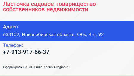 Ласточка, садовое товарищество собственников недвижимости по адресу 633102, Новосибирская область, Обь, 4-я, 92 в дальнейшем Организация, размещена в следующих категориях: