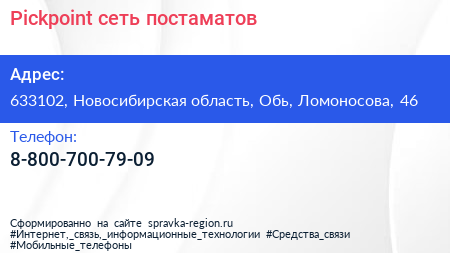Pickpoint, сеть постаматов по адресу 633102, Новосибирская область, Обь, Ломоносова, 46 в дальнейшем Организация, размещена в следующих категориях: