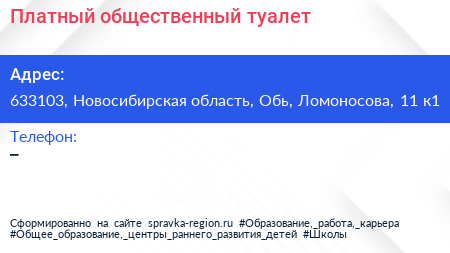 Платный общественный туалет по адресу 633103, Новосибирская область, Обь, Ломоносова, 11 к1 в дальнейшем Организация, размещена в следующих категориях: