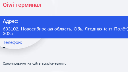 Qiwi, терминал по адресу 633102, Новосибирская область, Обь, Ягодная (снт Полёт), 302а в дальнейшем Организация, размещена в следующих категориях: