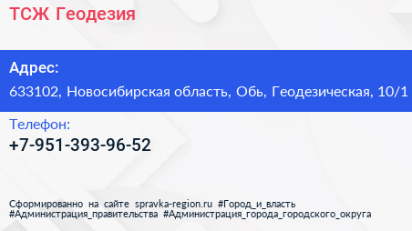 ТСЖ Геодезия по адресу 633102, Новосибирская область, Обь, Геодезическая, 10/1 в дальнейшем Организация, размещена в следующих категориях: