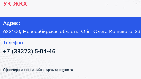УК ЖКХ по адресу 633100, Новосибирская область, Обь, Олега Кошевого, 33 в дальнейшем Организация, размещена в следующих категориях: