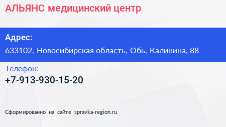АЛЬЯНС, медицинский центр по адресу 633102, Новосибирская область, Обь, Калинина, 88 в дальнейшем Организация, размещена в следующих категориях: