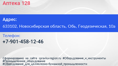 Аптека №128 по адресу 633102, Новосибирская область, Обь, Геодезическая, 10а в дальнейшем Организация, размещена в следующих категориях: