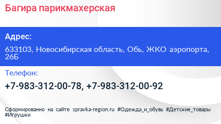 Багира, парикмахерская по адресу 633103, Новосибирская область, Обь, ЖКО аэропорта, 26Б в дальнейшем Организация, размещена в следующих категориях: