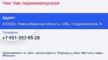 Чик Чик, парикмахерская по адресу 633102, Новосибирская область, Обь, Геодезическая, 8 в дальнейшем Организация, размещена в следующих категориях: