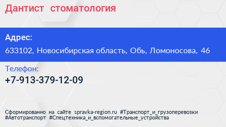 Дантист+, стоматология по адресу 633102, Новосибирская область, Обь, Ломоносова, 46 в дальнейшем Организация, размещена в следующих категориях: