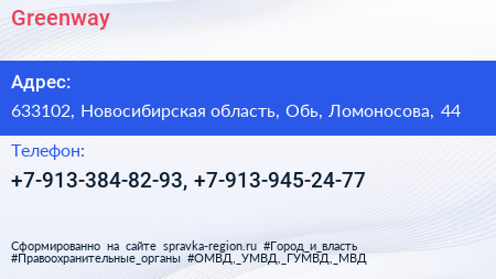 Greenway по адресу 633102, Новосибирская область, Обь, Ломоносова, 44 в дальнейшем Организация, размещена в следующих категориях: