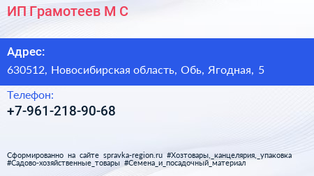 ИП Грамотеев М.С. по адресу 630512, Новосибирская область, Обь, Ягодная, 5 в дальнейшем Организация, размещена в следующих категориях: