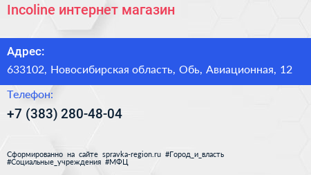 Incoline, интернет-магазин по адресу 633102, Новосибирская область, Обь, Авиационная, 12 в дальнейшем Организация, размещена в следующих категориях: