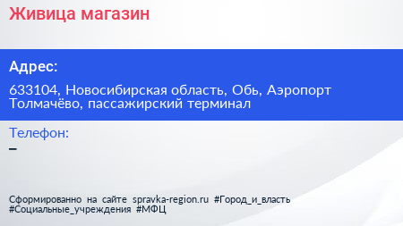 Живица, магазин по адресу 633104, Новосибирская область, Обь, Аэропорт Толмачёво, пассажирский терминал в дальнейшем Организация, размещена в следующих категориях: