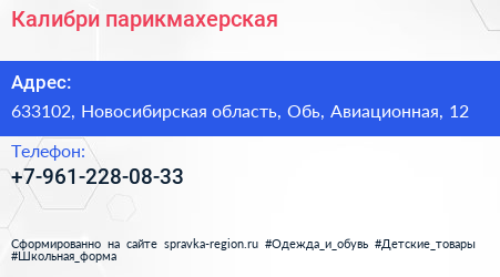 Калибри, парикмахерская по адресу 633102, Новосибирская область, Обь, Авиационная, 12 в дальнейшем Организация, размещена в следующих категориях: