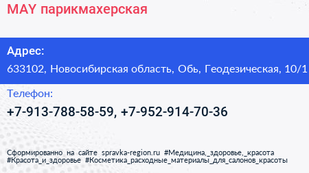 MAY, парикмахерская по адресу 633102, Новосибирская область, Обь, Геодезическая, 10/1 в дальнейшем Организация, размещена в следующих категориях: