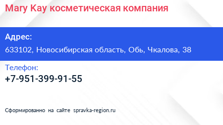 Mary Kay, косметическая компания по адресу 633102, Новосибирская область, Обь, Чкалова, 38 в дальнейшем Организация, размещена в следующих категориях: