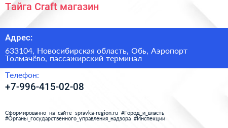 Тайга Craft, магазин по адресу 633104, Новосибирская область, Обь, Аэропорт Толмачёво, пассажирский терминал в дальнейшем Организация, размещена в следующих категориях: