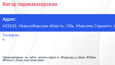 Вигор, парикмахерская по адресу 633102, Новосибирская область, Обь, Максима Горького, 6 в дальнейшем Организация, размещена в следующих категориях: