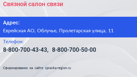 Связной, салон связи по адресу Еврейская АО, Облучье, Пролетарская улица, 11 в дальнейшем Организация, размещена в следующих категориях: