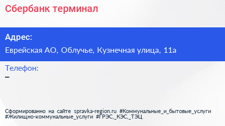 Сбербанк, терминал по адресу Еврейская АО, Облучье, Кузнечная улица, 11а в дальнейшем Организация, размещена в следующих категориях: