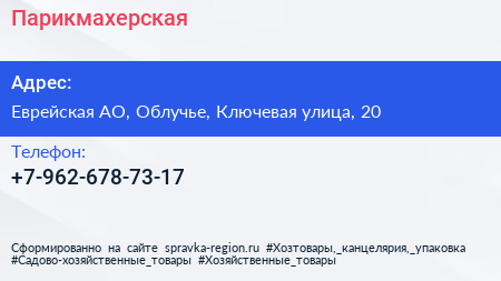 Парикмахерская по адресу Еврейская АО, Облучье, Ключевая улица, 20 в дальнейшем Организация, размещена в следующих категориях: