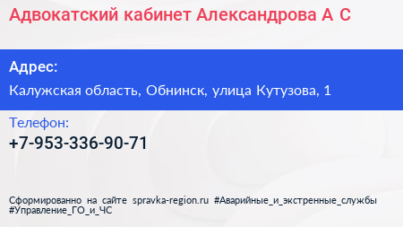 Адвокатский кабинет Александрова А.С. по адресу Калужская область, Обнинск, улица Кутузова, 1 в дальнейшем Организация, размещена в следующих категориях: