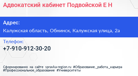 Адвокатский кабинет Подвойской Е.Н. по адресу Калужская область, Обнинск, Калужская улица, 2а в дальнейшем Организация, размещена в следующих категориях: