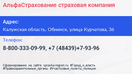 АльфаСтрахование, страховая компания по адресу Калужская область, Обнинск, улица Курчатова, 36 в дальнейшем Организация, размещена в следующих категориях: