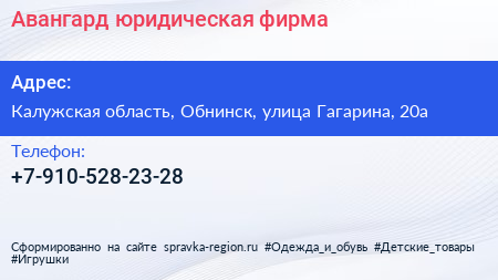 Авангард, юридическая фирма по адресу Калужская область, Обнинск, улица Гагарина, 20а в дальнейшем Организация, размещена в следующих категориях: