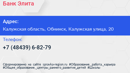 Банк Элита по адресу Калужская область, Обнинск, Калужская улица, 20 в дальнейшем Организация, размещена в следующих категориях: