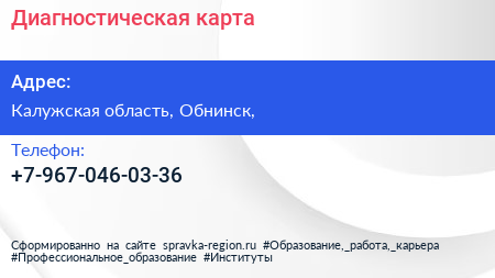Диагностическая карта по адресу Калужская область, Обнинск, в дальнейшем Организация, размещена в следующих категориях: