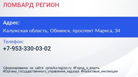ЛОМБАРД-РЕГИОН по адресу Калужская область, Обнинск, проспект Маркса, 34 в дальнейшем Организация, размещена в следующих категориях: