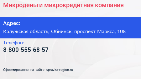 Микроденьги, микрокредитная компания по адресу Калужская область, Обнинск, проспект Маркса, 108 в дальнейшем Организация, размещена в следующих категориях: