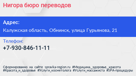 Нигора, бюро переводов по адресу Калужская область, Обнинск, улица Гурьянова, 21 в дальнейшем Организация, размещена в следующих категориях: