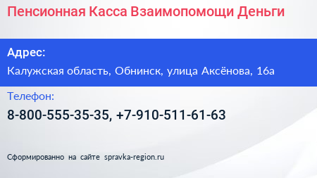Пенсионная Касса Взаимопомощи Деньги по адресу Калужская область, Обнинск, улица Аксёнова, 16а в дальнейшем Организация, размещена в следующих категориях: