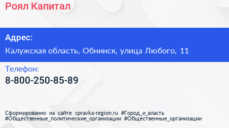 Роял Капитал по адресу Калужская область, Обнинск, улица Любого, 11 в дальнейшем Организация, размещена в следующих категориях:
